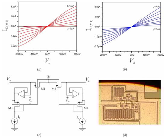 Electrical simulations of the I-V curves of the proposed P-R are shown in Figure 8a. The simulation considered a primary DC sweep of Va from −200 mV to 200 mV with Vb to ground. The pseudo-resistor resistance was adjusted through a secondary sweep, changing the current value of Ib, in this case, with steps of 1 µA from 2 µA to 9 µA. The following transistor sizes were considered: M1–M2 0.6 µm/1.2 µm; M3–M6 50 µm/10 µm, VDD = −VSS = 1 V and bias currents Ib1 = 10 µA, Ib2 = 50 µA. The fabricated P-R considering the same dimensions and electrical conditions was measured using the source-meter Keysight B2902A and the obtained I-V characteristic is depicted in Figure 8b. In this case, the current Ib was adjusted manually for a given P-R resistance value; as can be noticed, the measurement results were according to the simulation. The complete P-R schematic and microphotograph are depicted in Figure 8c,d.