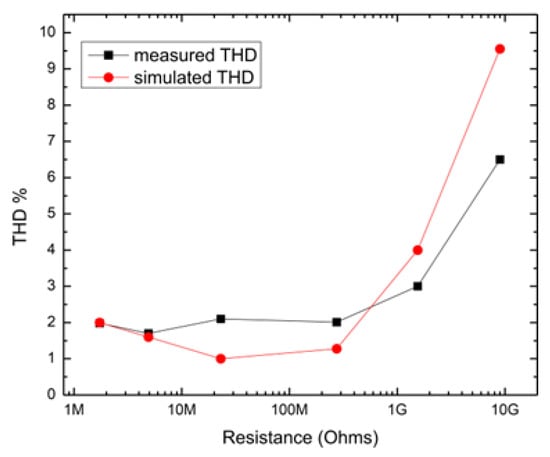 Simulated and measured THD vs. pseudo-resistor resistance.