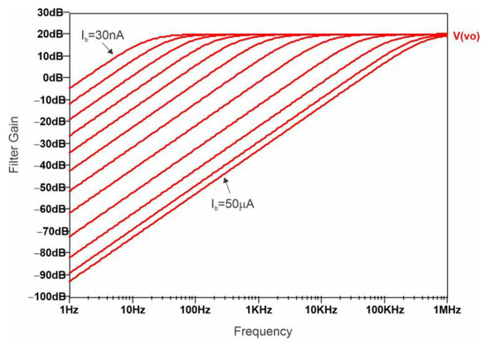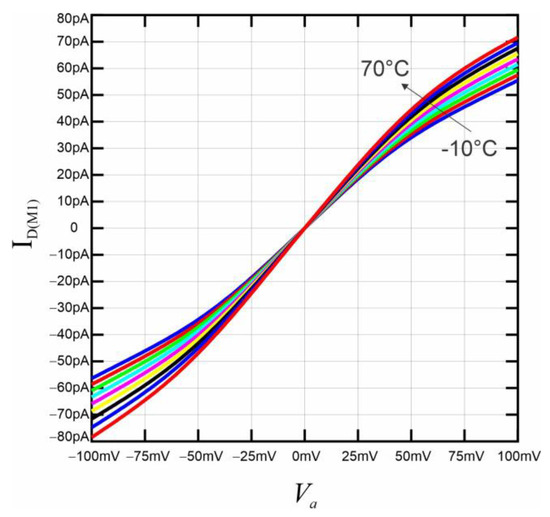 An example of the pseudo-resistor temperature dependence is depicted in Figure 11. The simulation was considered for a resistance value close to 1 GΩ in the −10–70 °C range with 10 °C steps. The resistance value changed from 1.47 GΩ to 1.11 GΩ, representing a change of 32% or 0.4%/°C.