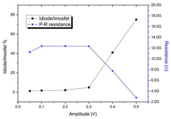 where RPR is P-R resistance value, Vp is the peak input voltage applied to the parasitic diode, IS the reverse saturation current, and Vt is the thermal voltage. Therefore, the solution of Equation (5) provides an approximation of the maximum allowable input amplitude for a given P-R resistance value. This is: