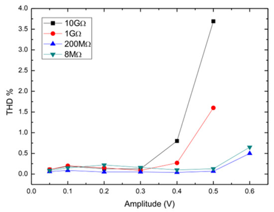 Unfortunately, the channel conductivity of a MOSFET working in subthreshold was highly affected by systematic changes in the source-gate potential, VSG. These changes caused the resistance of the tunable pseudo-resistor to vary drastically, affecting the device’s linearity. The MOSFET’s body effect represents an important cause for the deviation of the VSG potential; therefore, this work presented a new compact bias circuit based on a novel voltage follower lacking body effect. The proposed pseudo-resistor was simulated, fabricated, and characterized, providing a resistance value from 300 kΩ to 10 GΩ with a THD from <2.5% to 1 GΩ. The pseudo-resistor was incorporated into an OTA-based high-pass filter with simulated cutoff frequencies from 17 Hz to 470 kHz. These were obtained by adjusting the P-R resistance using fixed-valued capacitors in the pF range. Since the P-R was used in the OTA feedback, the filter THD was highly reduced when differential voltages were applied to the P-R when the filter gain was C1/C2 = 1. Therefore, the actual THD performance must be characterized by higher gains, in this case, C1/C2 = 10. The simulated THD results showed performance below 0.2% for applied voltages ≤ 0.3 Vp to the P-R. Different amplitudes activated the parasitic junction in M1 and M2 transistors affecting the P-R resistance and THD, as shown in Figure 17.