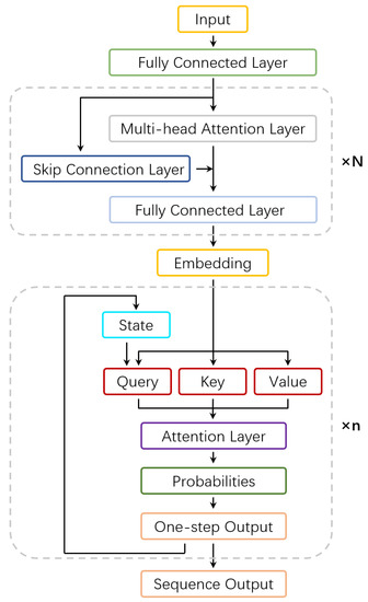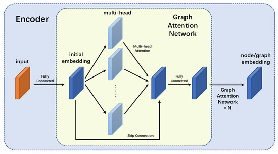 Finally, the node embeddings and graph embedding are calculated by the multi-head attention mechanism. In the complex multi-depot problem, shallow embeddings cannot effectively represent the features of nodes (the network depth is not enough). Therefore, this paper adopts improved graph attention networks to carry out calculations for deeper embedding. Each graph attention network contains a multi-head attention layer [18], a fully connected layer, and a skip connection layer [25]. The graph attention network is shown in Figure 1 and Figure 2. The multi-head attention layer is the core structure of the graph attention network; it aims to obtain the features of each node and the correlation among multiple nodes. The fully connected layer ensures that the input and output have the same dimension of t, allowing the graph attention networks to stack with each other. The skip connection layer retains the useful features from the previous layers to prevent them becoming invisible in subsequent calculations. Increasing network depth is crucial in deep neural networks, so the skip connection layer is also crucial to avoid the problem of gradient vanishing and exploding. The number of the stacked graph attention networks N should be selected moderately (N = 3 in this paper).