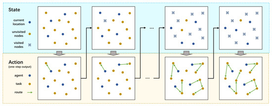 The process of obtaining the final solution from the problem example. Each action represents an agent executing a task, then each state updates the position of the agent and moves the executed task out of the candidate task set. The final strategy can be obtained by repeating actions and updating states continuously until all tasks are completed.