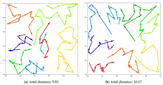 Additionally, the two models of Figure 7a,b yield completely different strategies for the task allocation. The model of (a) tends to select neighbor points with a closer distance, while the model of (b) gives priority to placing tasks of one path in the same area. The reason for this phenomenon might be that the two models learned different features during the training process. One model learns more about the distribution of nodes, and the other learns more about the spatial distance between nodes.