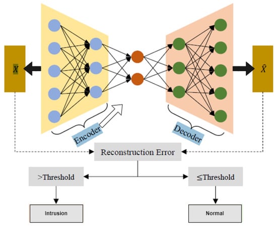 The training process involves minimizing the reconstruction error between the input data and the reconstructed data, which can be achieved by optimizing the parameters of the encoder and decoder networks using gradient descent or other optimization algorithms. Once the autoencoder is trained, it can be used for various tasks such as encoding input data to obtain lower-dimensional representations, generating new data samples from the learned representations, or using the encoder as a feature extraction module for downstream tasks. In the context of anomaly detection, the trained autoencoder was used to reconstruct new, unseen network traffic data, and the reconstruction error was compared to a predefined threshold. If the reconstruction error was above the threshold, the network traffic was classified as an anomaly. This approach is particularly useful for detecting novel or unknown anomalies, as the autoencoder can detect any deviations from the normal patterns it has learned during training. Figure 1 presents a visual representation of the approach used for detecting anomalies with an autoencoder.