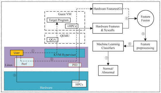 Next, we will provide a detailed description of how to obtain the hardware feature of the GVM at both the virtualization level and the physical machine level. The structure of the KVM virtualization environment we built is shown in Figure 2. The process of obtaining the vHPC data features of the GVM at the virtualization level is illustrated in Steps 1 and 2 of Figure 2. The hardware components, including the vCPU, inside the GVM, are virtualized by the underlying physical machine through the VMM and QEMU. Therefore, when the GVM runs an application, the perf tool can interact with the VMM or KVM kernel to obtain the feature data of the vCPU.