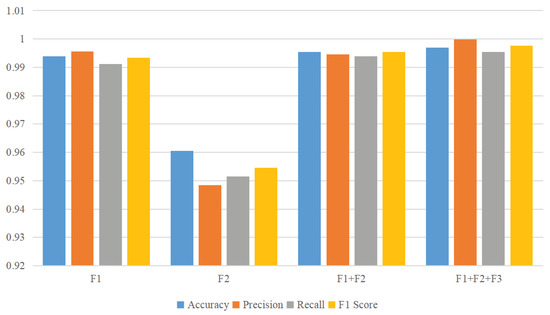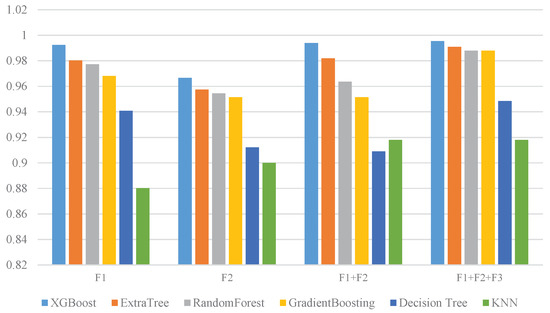 Figure 5 shows that the XGBoost model achieved the highest Accuracy on the F1, F2, F1 + F2, and F1 + F2 + F3 datasets, with Accuracies of 99.24%, 96.67%, 99.39%, and 99.55%, respectively. This experiment demonstrated that the Accuracy of the data features obtained at the virtualization level was higher than that obtained at the physical machine level. As the features were progressively fused, the Accuracy increased.