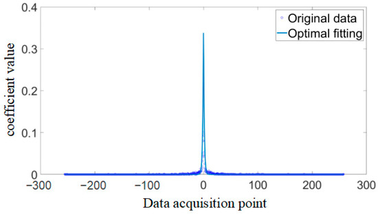 However, as shown in Figure 3, when the Laplace distribution is used to fit the current data curve, the error is still relatively large. As the values on the fitted curve approach zero, the DCT coefficient points strongly diverge from the fitted curve, indicating that the feasibility of the above formula is limited. Therefore, this paper proposes a probability distribution curve for the DCT coefficients that is more consistent with the distribution obtained after DCT processing. The formula for solving the curve fitting problem is as follows: