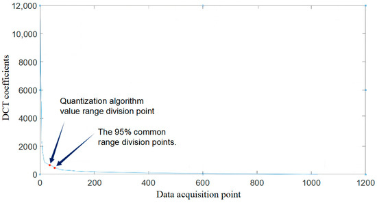 For a more detailed comparison, 1024 coefficient points were selected for this study from the current data collected from the CNC machine tool under certain conditions, and the absolute values of the DCT coefficients were then sorted. The range division point generated by the algorithm based on Equation (4) and the empirical division point used in previous methods are compared in Figure 5.
