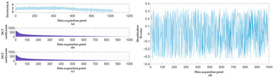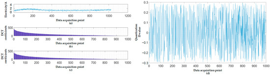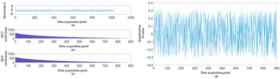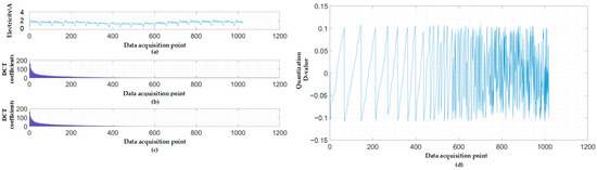 As shown in Figure 7, Panel (a) shows the experimental situation of the load current, Panel (b) shows the absolute-value-sorted current DCT coefficients after value range division, and Panel (c) shows the absolute-value-sorted current DCT coefficients after quantization. The DCT coefficient error is within 0.1.