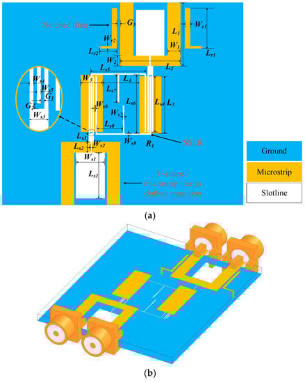 Layout of the designed balanced broadband filter: (a) Top view; (b) 3D view.