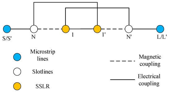 The designed balanced wideband filter is observed in Figure 1, and is composed of SSLRs, two U-shaped microstrip line to slotline transition structures, and quarter-wavelength short-circuited resonators. The orange block is the microstrip line located on the top surface of the substrate, while the white one shows the slotline on the bottom surface. For a balanced wideband BPF, there are two main parts: the DM part and the CM part. The wide DM passband is implemented by employing the proposed SSLRs. Figure 2 shows the coupling scheme of the proposed balanced wideband BPF. In order to generate two TZs, the pseudo-interdigital coupling between the proposed SSLRs is employed, which can improve the passband selectivity. U-shaped microstrip lines to slotline transition structures are used to implement a good and wideband CM suppression. Meanwhile, the CM responses are independent from the DM ones, which can simplify the design procedure. Moreover, two quarter wavelength shorted circuit resonators are loaded adjacent to the input ports to generate the notched band. The proposed balanced BPF is realized based on the Rogers RT/Duroid 5880 [9]. (εr = 2.2, tanδ = 0.0009, h = 0.8 mm). The dimensions are shown in Table 1.