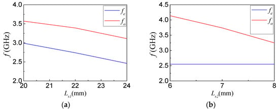 where c is the light speed in free space and εeff represents the effective dielectric constant of the substrate. Since SSLR is symmetrical in structure, an odd- and even-mode analysis method can also be employed. Similar to SLR, SSLR also has two resonant frequencies (fe, fo) that can be adjusted independently by controlling the dimensions. Figure 4 shows the resonant frequencies of the proposed SSLR with Ls1 and Ls2, which are simulated by the software High Frequency Structural Simulator (HFSS). It can be seen from Figure 4 that the two resonant frequencies are changed to the lower frequency by increasing Ls1, while fo can be independently controlled by Ls2. To further verify the validity of our analytical method, SSLR is analyzed through the characteristic mode analysis (CMA) with CST Microwave Studio [10]. The working principle of arbitrarily shaped structures can be intuitively provided without being affected by external excitation sources. During the simulation process, SSLR is etched on the bottom layer of the dielectric. The results show that two characteristic modes are generated from 2 to 10 GHz. The two characteristic modes, named modes 1 and 2, are implemented at 2.5 and 3.7 GHz, respectively. The electric field distribution of SSLR proposed in a different mode is shown in Table 2. The conclusion obtained by CST simulation is consistent with that obtained by HFSS simulation.