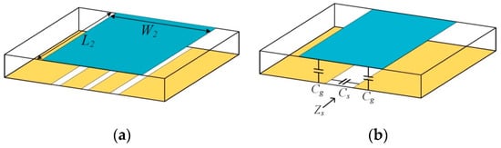 In [10], the designed balanced BPF is realized by employing four microstrip lines to slotlines conversion, which results in the increased insertion loss and larger size. In this work, the proposed BPF is based on SSLRs, and two microstrip lines to slotline conversions are needed. It is easier to achieve lower loss and miniaturization. At the same time, a three-slotline couple structure is employed. Generally, the length of the slotline is a quarter wavelength. In order to increase the coupling strength between the three slotlines, a rectangular metal is used on the other side, as given in Figure 5a. The main parameters of the enhanced coupled structure are the characteristic impedance (Zs) and the coupling capacitance (Cs), as given in Figure 5b. By introduing a back shielding strip, the per-unit-length shunt capacitance can be increased from Cs to (Cs + 2 × Cg) while Zs will be decreased. Meanwhile, its transmission performance is shown in Figure 6. Through adjusting the dimension of the rectangular metal, different characteristic impedance (Zs) and coupling capacitance (Cs) can be achieved. Therefore, the coupling strength of the three-slotline coupled structure can be changed.