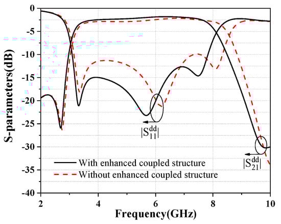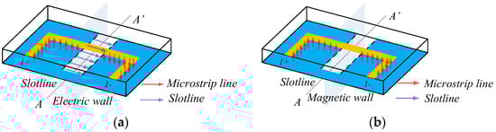 The electric field distributions in the U-shaped microstrip line to the slotline transition structure under DM and CM operation are shown in Figure 8, respectively, where A-A′ is the symmetry plane of the U-shaped microstrip line to slotline transition structure. When a DM excitation is applied, the plane of symmetric A-A′ can be equivalent to an electrical wall. The DM signals in the U-type microstrip line can be transmitted into the slotline modes with strong magnetic coupling, and then transformed to the next one. On the other hand, when a U-shaped microstrip line to slotline transition structure are under the CM operation, a virtual magnetic wall can be implemented at the symmetric plane A-A′. The magnetic wall is perpendicular to the electric field of the slotline mode, which conflicts with the magnetic wall’s boundary condition. Therefore, the slotline cannot achieve the transmission of CM signals. So, the CM signals will be rejected. The suppression characteristic of the U-shaped microstrip line to slotline transition structure on CM signals is inherent and independent of the operating frequency, as shown in Figure 9. As a result, the design complexity can be reduced significantly.