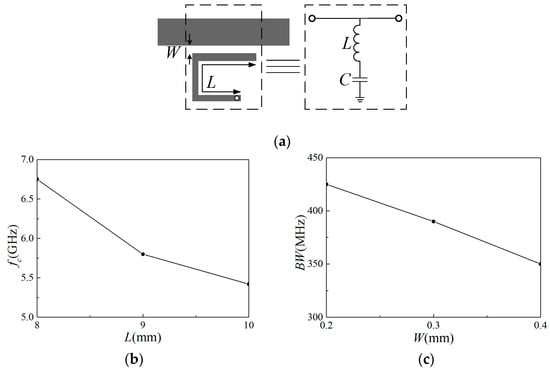 (a) Layout and equivalent circuit, (b) center frequency on L length, and (c) bandwidth of the coupled resonator with varied parameters.