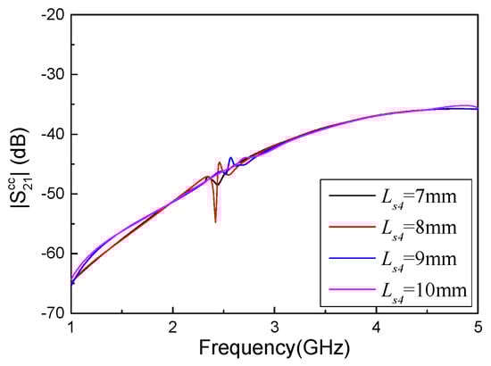 The DM notched band is realized by introducing a folded quarter-wavelength resonator. The resonator is short-circuited and can be equivalent to one parallel series LC resonance circuit. The frequency responses of the coupled short-circuited quarter-wavelength resonator with different lengths are simulated by HFSS, as given in Figure 7. The simulated results show that the resonant frequency and the bandwidth can be controlled independently by adjusting the length L of the coupling resonator and the gap between the coupled resonator and the microstrip line. Therefore, by appropriately adjusting the dimensions of the short-circuited resonator, the notched band can be achieved at the desired frequency.