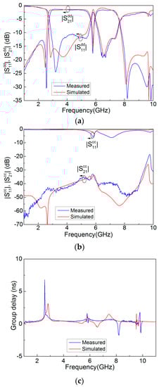 Comparison of the simulation and measurement (1–10 GHz): (a) DM reflection coefficient and transmission coefficient; (b) CM reflection coefficient and transmission coefficient; (c) DM group delay.