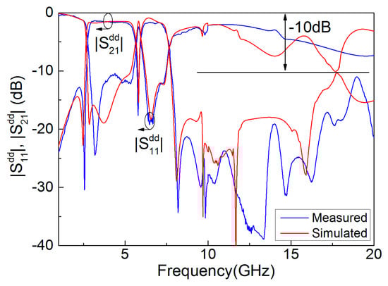 In order to prove the design idea, a balanced broadband filter is manufactured and measured, as given in Figure 10. The total effective dimension is only 33.2 mm × 25 mm. Figure 11 shows the comparison of the simulated results and the measured ones. The S-parameters of the proposed filter were measured with an Agilent vector network analyzer (VNA) N5230A. The measured DM passband center frequency is 5.1 GHz, with a 3-dB FBW of 92%. The insertion loss of the center frequency is better than 1.9 dB. Meanwhile, one narrow notched band with a 3 dB bandwidth of 4.9% is realized by employing one coupled quarter-wavelength short-circuited resonator at the input ports. In addition, the DM stopband can be extended to 20 GHz with a rejection level of 10 dB, as shown in Figure 12. For the CM suppression, the rejection level is more than 30 dB, covering the DM passband. The discrepancy between the measurement and the simulation results is due to the error of simulation as well as the error of PCB fabrication and measurement. We compared the performances of the proposed filter and the other ones, as given in Table 3. It can be observed that the designed balanced broadband filter shows better performances in the DM passband selectivity and CM block.
