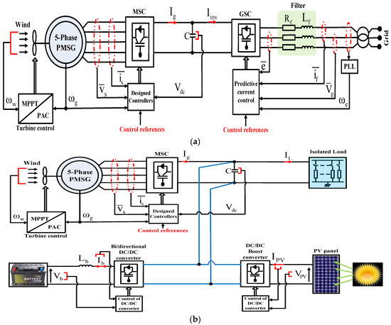 The system under investigation is depicted in Figure 1. It consists of a wind generation system that incorporates a five-phase PMSG, a PV solar system, and a battery. The system, as mentioned earlier, can operate in two states: the first, in which the system is connected to the grid via a converter (GSC), which is controlled using the PCC principle (Figure 1a); and the second, in which the system is feeding an isolated load (Figure 1b). The system also includes the controllers used with all components. The control systems include the battery control system, the PV panel’s converter control system, the turbine power system, and the five-phase PMSG control system as well. Therefore, all of these units must be accurately emulated and adjusted for each particular task in order to preserve proper system operation.