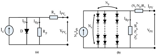 In a solar cell, solar energy is converted into electrical energy using the photovoltaic phenomenon. A solar cell’s circuit is shown in Figure 2a [41].