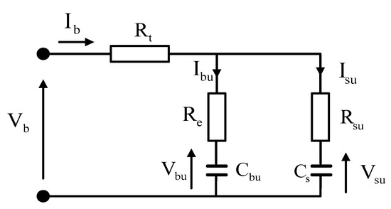 A power storage unit is essential to cover the power reduction during harsh weather conditions due to the discontinuous wind speeds and low irradiation levels. Accordingly, the equivalent battery circuit is illustrated in Figure 3. where the variables and pertain to the voltage and current of the battery, and to the bulk and surface currents, , and to the terminal, end, and surface resistances, and and to the surface and bulk capacitances, respectively [43].