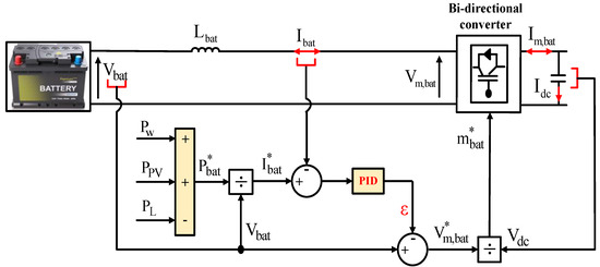 A bi-directional converter must be used to manage the battery operation. A view of the battery storing system is illustrated in Figure 4. A converter’s continuous model is used, through which the modulated voltage () and current () of the battery are represented by