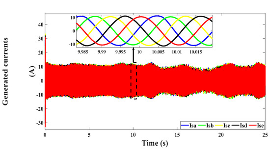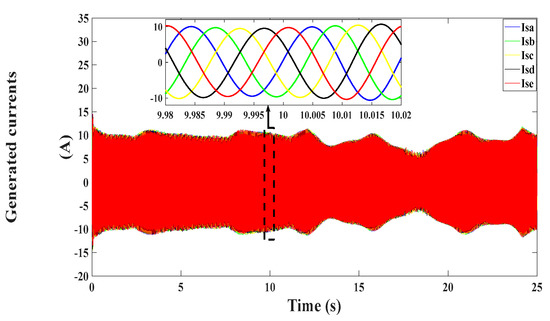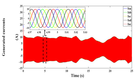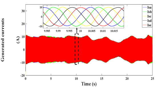 In wind systems, a variety of generator topologies were utilized, starting with the asynchronous generators with their different categories, such as squirrel cage or wound rotor types [20,21], and then moving forward to the synchronous generators with permanent magnets [22]. However, there is still an obvious gap in studying the performance of wind generation systems using multi-phase machines as an alternative to the traditional, previously mentioned three-phase machine types. Multi-phase machines have recently attracted new interest [23,24]. Furthermore, having a lot of phases enables power segmentation, which distributes loads across a variety of components [25]. This makes it possible to use power components with high switching frequencies, which reduces the current harmonics and the torque ripples [26,27]. These benefits shouldn’t, however, obscure how intricate their control is in both normal and impaired modes [28]. Due to the advantages of multi-phase machines, several studies have been presented to achieve the optimal performance of such machines.