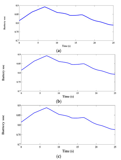 Battery SOC: (a) PTC, (b) PFC, and (c) Proposed.