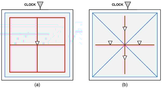 - Su, H.; Sapatnekar, S.S. Hybrid Structured Clock Network Construction. In Proceedings of the IEEE/ACM International Conference on Computer Aided Design (ICCAD), San Jose, CA, USA, 4–8 November 2001; pp. 333–336. [Google Scholar] [CrossRef]