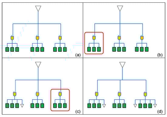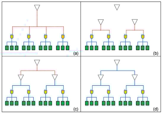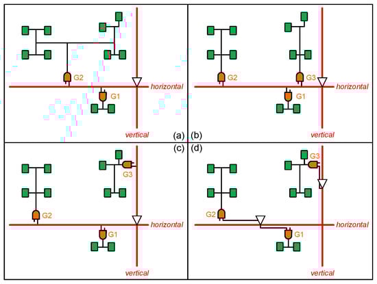 The example in Figure 1 illustrates the influence of the driving buffer’s location and the mesh wire’s connection on load capacitance and power consumption, and the advantage of cross-mesh architecture. In this section, we further illustrate the reasons for applying clock gating and load balancing techniques on the local clock tree, and analyze the capacitance and power consumption of register clusters in each kind of subtree topology. Through the example in Figure 2a–c, we illustrate how clock gating and load balancing techniques can reduce the capacitance load on mesh wires. Figure 2d illustrates how we integrate these two optimization techniques into the cross-mesh architecture to further reduce the capacitance load. Details of this example are described below.