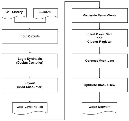- Lu, J.; Mao, X.; Taskin, B. Integrated Clock Mesh Synthesis with Incremental Register Placement. IEEE Trans. Comput. Aided Des. Integr. Circuits Syst. 2012, 31, 217–227. [Google Scholar] [CrossRef]
