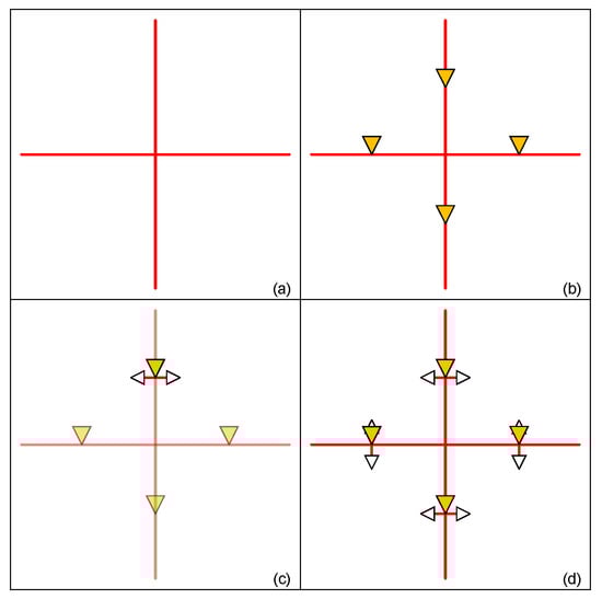 In Equations (3) and (4), Cross-Meshx and Cross-Meshy are coordinates of the cross-mesh. After completing mesh wire construction, we start to insert drive buffers in the mesh structure. For the example in Figure 4a, there are four directions of the wire in the tree (red line). At first, we put drive buffers on the center of each piece of mesh wire (orange triangle) as shown in Figure 4b. The mesh tree will use these four buffers to drive cells. Because the complexity of IC design grows drastically, it is insufficient to drive the cross-mesh using only four drive buffers. We divide the original triangular drive area in half using mesh wire as in Figure 4c, adding two additional drive buffers (white triangle) to make up the drive strength. The design with a completed mesh structure is as shown in Figure 4d.