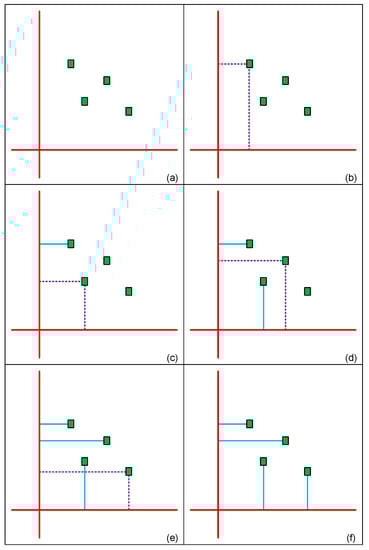 Example of allocating driving buffer (a) four free registers to be classified (b) compare distance to mesh wires (c) connect to drive buffer with less distance (d) connect to drive buffer that has less registers connected to it (e) select drive buffer randomly on equal condition (f) completed allocation.