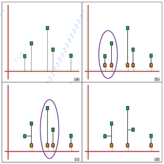 Example of register clustering algorithm (a) each register is a cluster (b) two registers near to each other are chosen (c) merge chosen registers into a cluster and continue to merge other registers (d) completed register clustering.