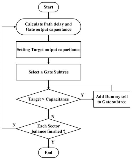 In this stage, we optimize the timing issue in two phases. The first phase is to optimize the timing difference between the clock gate subtrees. We use load matching technology to build the clock tree in order to make the clock skew close to zero. In order to make the load capacitance in each clock gate subtree closer, we insert dummy cells to make the delay of clock gates consistent. Figure 9 shows the load balancing algorithm. In the beginning, we first calculate the path delay and capacitance before optimization, find the clock gate subtree with the largest capacitance value, and set its capacitance value as the target capacitance value. Then, we select each clock gate subtree in order and compare its capacitance with the target capacitance value. If it is less than the target capacitance value, we calculate the difference and estimate how many dummy cells are needed to reach the target capacitance using Equations (6)–(8).