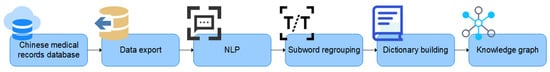 Medical treatment is a part of Chinese nationals’ health monitoring. At present, medical data are diverse and complex []. Although China has a well-established system of recording medical records, in most cases, patients’ symptoms, medications, and therapies are recorded in natural language and are highly fragmented. This makes it difficult for researchers in the medical field to retrieve and organize medical records. Knowledge graphs based on graph database technology can effectively solve these problems. They can transform large-scale medical record data into a form that conforms to the graph database model through data analysis, processing, and normalization operations, which facilitates the subsequent construction and querying of the knowledge graph. Through the construction of entity extraction and dictionaries of drugs and treatment plans based on the method of participle reorganization, the key information in Chinese medical records can be effectively extracted and indexed to provide the basis for the subsequent knowledge graph modeling.