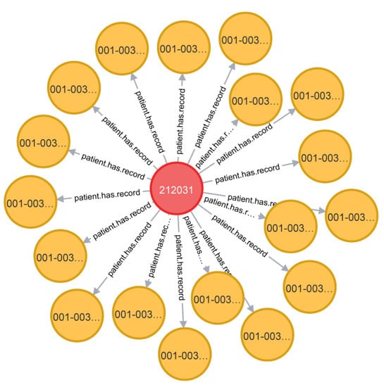 Take the relationship “patient has a record number” as an example. Due to the privacy of information, patients are identified by patient number in the data table. Stored in a graph database, a graph about the custom relationship can be obtained. As shown in Figure 4: