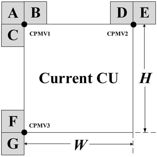 where and represent the motion vectors in the horizontal and vertical directions of the current encoding sub-blocks , and W is the width of the current encoding unit; thus, is the distance between Control-point 1 and Control-point 2, and , , , and are the components of Control-point 1 and Control-point 2. The results of the four parameters are delivered only by and . Through this method, the current encoding unit can be obtained from the motion vectors of 4 × 4 sub-blocks.