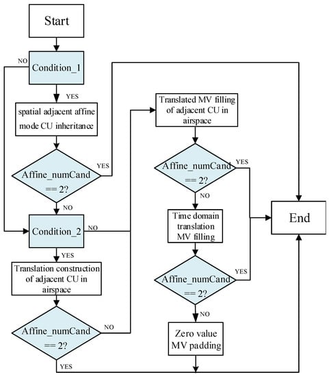 In the process of constructing the candidate list for AAMVP, the adjacent blocks of adjacent affine modes in the spatial domain need to meet three conditions: first, they must be in inter-frame encoding mode, then in affine encoding mode, and, finally, the reference image must be the same as the current CU reference image. The translation construction of the adjacent CU in the same spatial domain also needs to meet three conditions: first, the inter-frame encoding mode, then the nonaffine encoding mode, and, finally, the reference image must be the same as the reference image of the current CU. We define the first condition as . The second condition is . When the conditions are not met, the judging of the current neighboring block is skipped in advance, and there is no need to perform other complex condition calculations and judging. At the same time, in the process of constructing the candidate set, after each step, a judging is made on whether the candidate set is filled. If the candidate set has already been filled in the current step, the subsequent judging steps are skipped, which can achieve the early termination of the candidate list construction process and reduce the computational burden of the encoder in this step. Figure 4 below is the optimization flowchart of AMMVP.