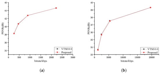 At the same time, the evaluation index uses the Bjøntegard delta bitrate (BDBR) [35] to measure the encoding performance of the proposed algorithm and the original algorithm on bitrate. A negative number of data indicates that the proposed algorithm can save the corresponding data volume, while a negative number indicates an increase in data volume and poor performance. In addition, the Bjøntegard delta peak signal-to-noise rate (BD-PSNR) was used to evaluate the performance index of the proposed algorithm and the original algorithm in encoding image quality. A positive value represents an enhancement of the processed image quality, while a negative value indicates significant distortion and poor performance compared to the original image. Table 2 provides parameter information for the test sequence.