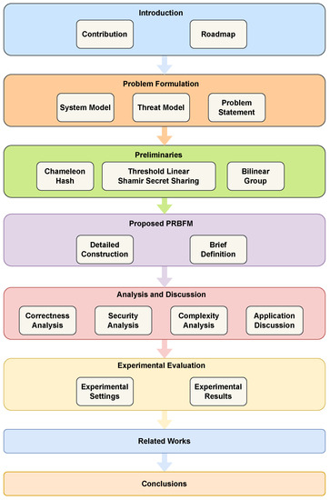 The structure of this paper is shown in Figure 1. Section 2 details the system model, threat model, and problem formulation. Proceeding further, Section 3 presents the preliminaries utilized in PRBFM. Subsequently, in Section 4, we formalize our scheme by presenting the definition and detailed construction of PRBFM, while the analysis and applications are discussed in Section 5. Several experiments based on the FISCO blockchain and the real-world dataset are conducted in Section 6. Finally, we discuss several related works about the redactable blockchain in Section 7 before reaching the conclusion in Section 8.
