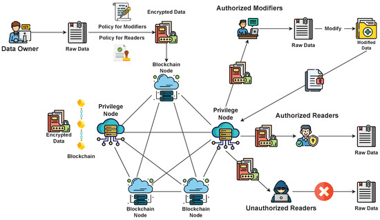 In this section, we formulate the problem addressed by the proposed PRBFM scheme. This scheme involves three different types of entities: nodes, users, and data owners. The nodes are responsible for storing the data of corresponding owners and executing data queries from users with permission. Notably, the nodes can be divided into three main types: privilege nodes (i.e., consortium nodes), storage nodes (i.e., cloud nodes), and computation nodes (i.e., edge nodes). The users usually represent requesters in realistic mobile crowdsensing scenarios. According to their attributes and the policy of the data owner, they can be split into three roles: unauthorized users, authorized users, and authorized modifiers. Unauthorized users are unable to perform any actions on the uploaded data. Authorized users have read-only access to the uploaded data. On the other hand, authorized modifiers can both access and modify the contents of the uploaded data. Similar to the users, the data owners mainly represent individuals or organizations in real-world mobile crowdsensing scenarios. Their prior task is to crowdsense raw data, then encrypt and upload them to the blockchain. The system model is presented in Figure 2.