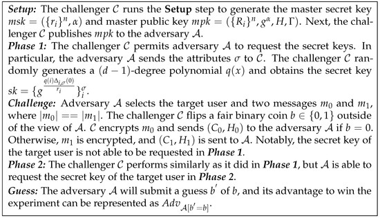 - Liu, Z.; Cao, Z.; Wong, D.S. Blackbox traceable CP-ABE: How to catch people leaking their keys by selling decryption devices on ebay. In Proceedings of the 2013 ACM SIGSAC Conference on Computer & Communications Security, Berlin, Germany, 4–8 November 2013; pp. 475–486. [Google Scholar]