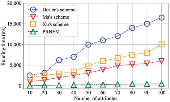 First, we measure the performance of the KeyGen step on the privilege node regarding computational costs. We varied the number of attributes from 10 to 100, and the results are displayed in Figure 5. The experimental results indicate that the PRBFM schemes are more efficient in comparison to other schemes. For instance, when the size of attributes is set to 100, PRBFM takes only 1 s to complete key generation, while Derler et al.’s scheme, Ma et al.’s scheme, and Xu et al.’s scheme require 17s, 6s, and 10s, respectively. The reason for this disparity is that the privilege nodes in PRBFM only select one Lagrange polynomial randomly and perform operations with complexity. In contrast, the three other proposed schemes require pairing operations or hash calculations to obtain the secret key.