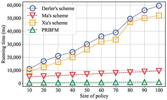 Regarding Figure 7a, the time consumption is evaluated with the policy size ranging from 10 to 100. The practicality of the Verify step in all schemes for real-world scenarios is evident. Notably, PRBFM only needs to verify the generic trapdoor, while Derler et al.’s scheme and Ma et al.’s scheme are required to verify both the generic and ephemeral trapdoor. Therefore, the time consumption for Derler et al.’s and Ma et al.’s schemes is comparatively higher than PRBFM’s. Additionally, Xu et al.’s scheme requires more time-consuming operations during the verification step, resulting in it having a higher time consumption than any other scheme.