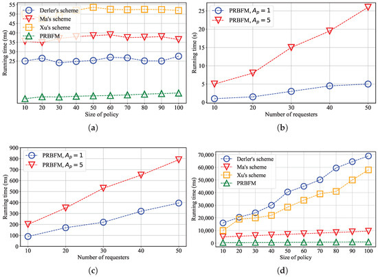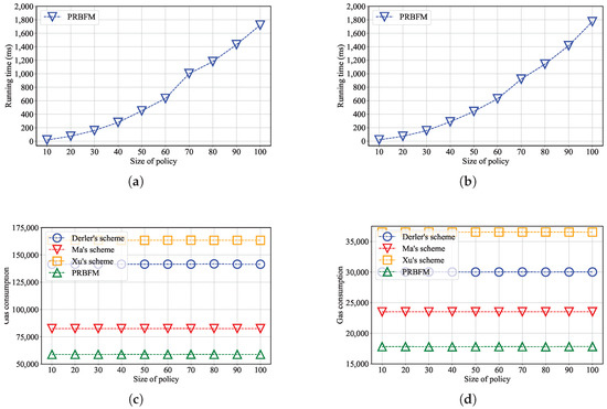 Finally, we evaluated the proposed schemes’ performance in terms of costs (i.e., gas) on the FISCO blockchain. We varied the policy size from 10 to 100, and the experimental results are exhibited in Figure 8c,d. As illustrated, the gas cost for PRBFM is lower than that of the other schemes. This result is due to PRBFM exclusively updating or requesting one hash value, whereas Ma et al.’s scheme, Derler et al.’s scheme, and Xu et al.’s scheme involve 2, 4, and 6 values, respectively.
