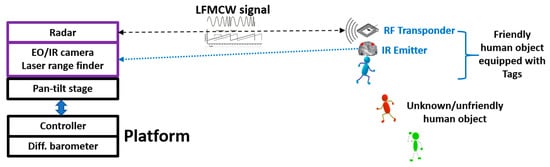 Figure 1 illustrates the complete structure of the MEIRFS sensor system designed for human object detection, recognition, and tracking. The edge platform (UAV or UGV) is equipped with all the required sensors for detecting and continuously tracking human objects. These sensors include the ranging radar, EO/IR camera, laser range finder, differential barometer, and a pan/tilt platform. Additionally, the known friendly object (designated as blue in Figure 1) is equipped with an IR emitter and an RF transponder, enabling easy recognition by the MEIRFS system amidst all the detected human objects. Ideally, it would be desirable to have a solution that can accurately detect and identify friendly human objects without the need for additional tags or markers. However, in practical scenarios, it is challenging, if not impossible, to find a single method that can work effectively in all situations. For instance, visible light imaging can provide valuable color and feature patterns that can be used to differentiate between unknown friend and foe objects in well-illuminated environments. However, this approach may not be effective in low-light or dark environments. In such cases, additional measures are necessary to promptly and correctly identify friendly human objects.