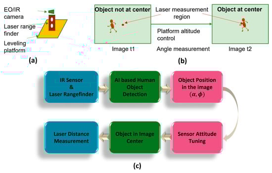 The hardware arrangement of the IR subsystem is depicted in Figure 3a. Both the IR camera and the laser rangefinder are aligned to point in the same direction and are mounted on the pan/tilt platform, allowing for rotation in various directions. The laser rangefinder is utilized to measure the distance of the object located at the center of the IR image’s field of view. As shown in Figure 3b, the process begins with the capture of the first image from the IR camera, which detects the human object. The object’s position within the IR image’s field of view is then calculated. Subsequently, the lateral angle position and the vertical angle position of the object relative to the IR camera’s pointing direction can be determined. These calculated angle positions are then sent to the pan/tilt platform, which adjusts the IR subsystem’s orientation to center the object within the IR camera’s field of view. Thus, at time instant , the distance of the object can be measured using the laser rangefinder. Figure 3c presents the flowchart illustrating the working principle of the EO/IR subsystem, highlighting its functionality in detecting, tracking, and measuring the distance of the object of interest.