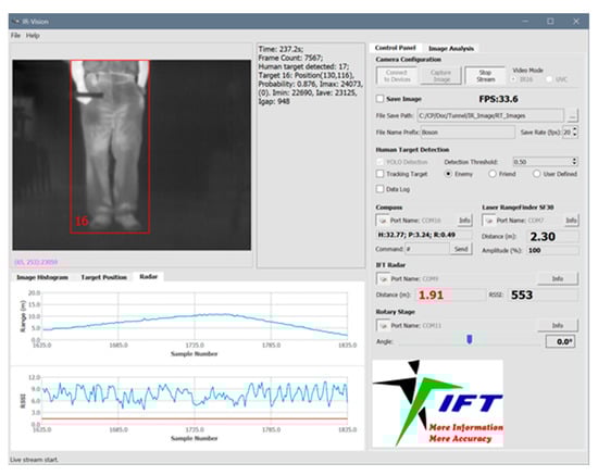 The measurement results from the various sensors in the MIERFS system are transmitted to the host computer at different data update rates. To ensure accurate tracking of the object, these measurements are synchronized within the GUI software to calculate the object’s position. In the MIERFS system, the IR camera plays a crucial role in human object detection, recognition, and tracking. Therefore, the measurements from other sensors are synchronized with the update rate of the IR camera. During our testing, the real-time human object detection process achieved a continuous frame rate of approximately 35 frames per second (fps) when the laptop computer (equipped with an Intel Core i9-11900H CPU and Nvidia RTX-3060 laptop GPU) was connected to a power source. When the laptop computer operated solely on battery, the frame rate reduced to about 28 fps. Each time a new frame of the IR image is received in the image acquisition thread, the software updates the measured data from all the sensors. The synchronization ensures that the measurement results from different sensors are aligned with the latest IR image frame, providing accurate and up-to-date information for human object detection and tracking.